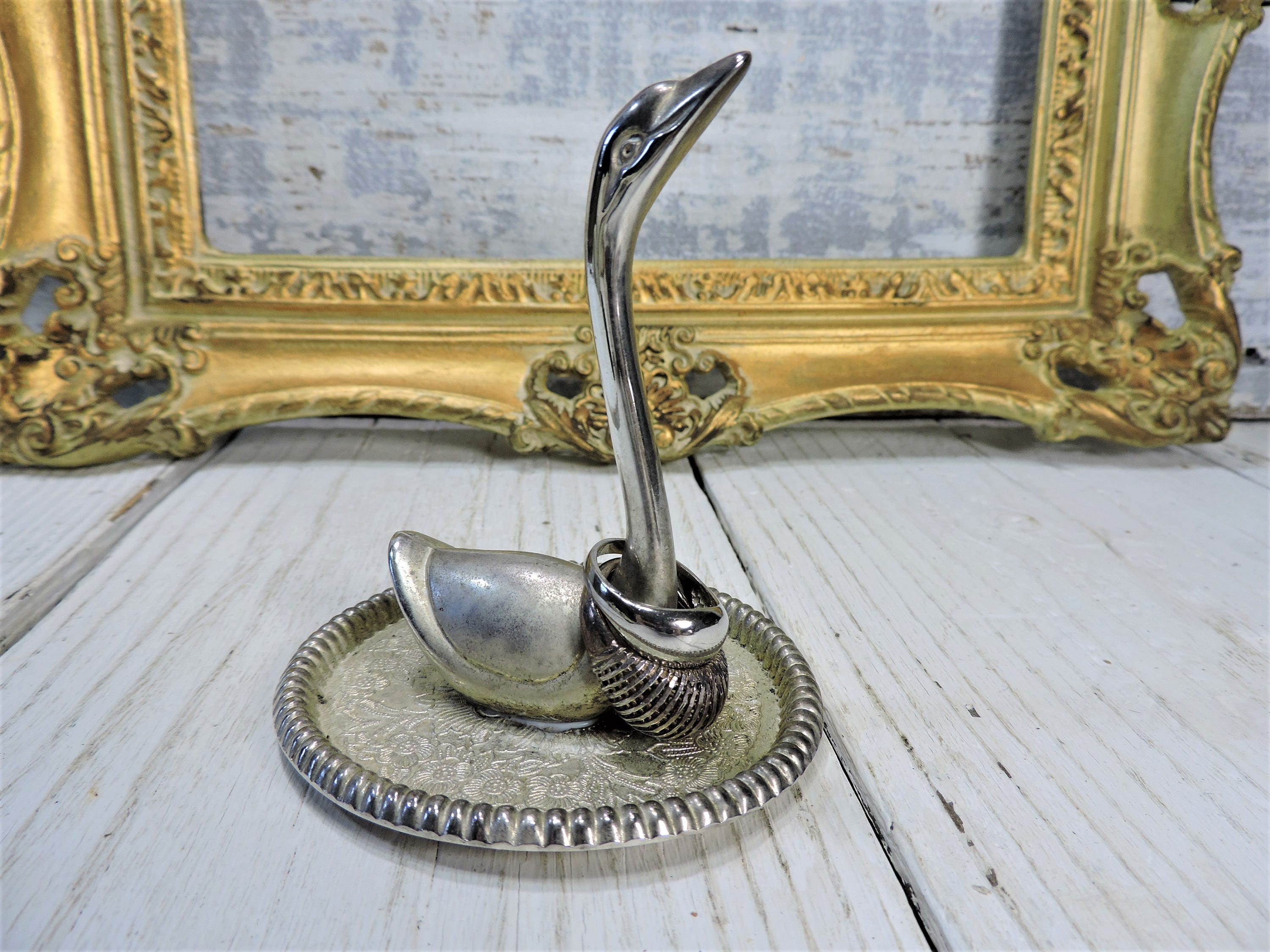 Swan Ring Holder Silver Plated With Etched Silver Plate Tray Vintage Jewelry Holder Vanity Accessory Wedding Ring Holder Gift For Bride